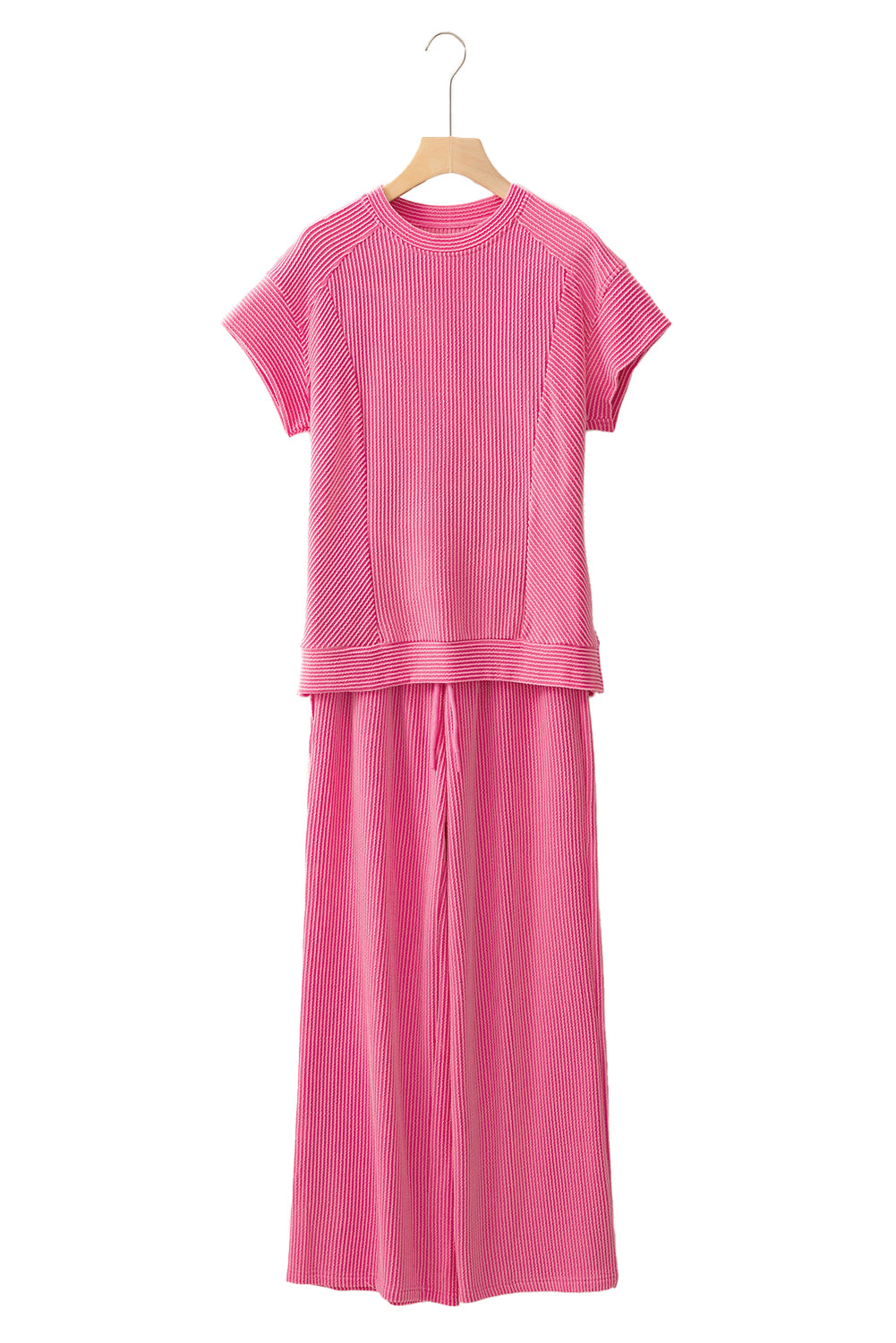 Blue Solid Corded Short Sleeve T Shirt and Wide Leg Pants Set