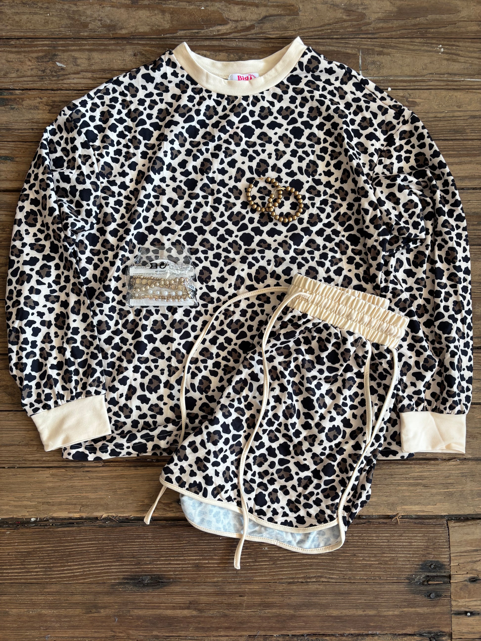 Brown Leopard Print Contrast Trim Two Piece Shorts Set