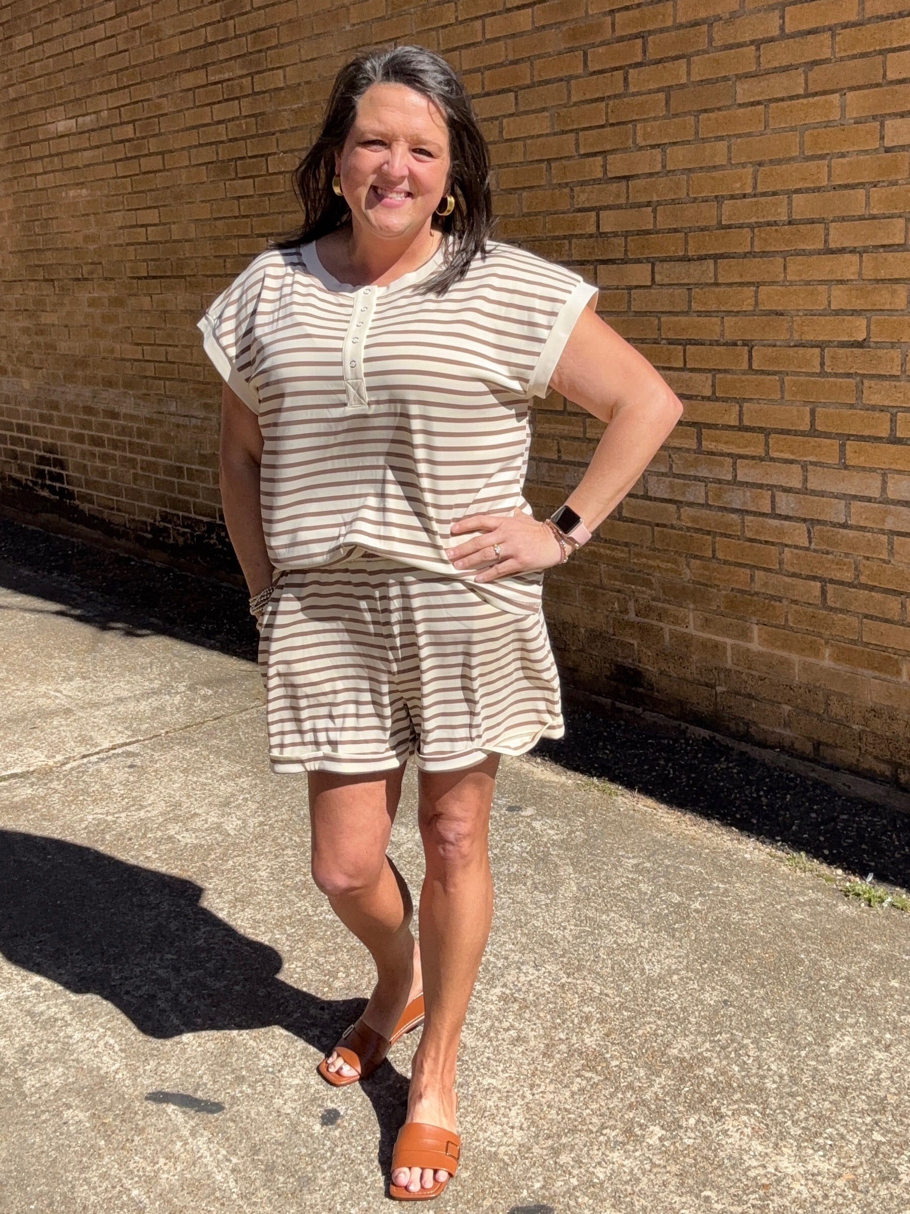 Striped print adds timeless appeal to this women’s top and shorts set.