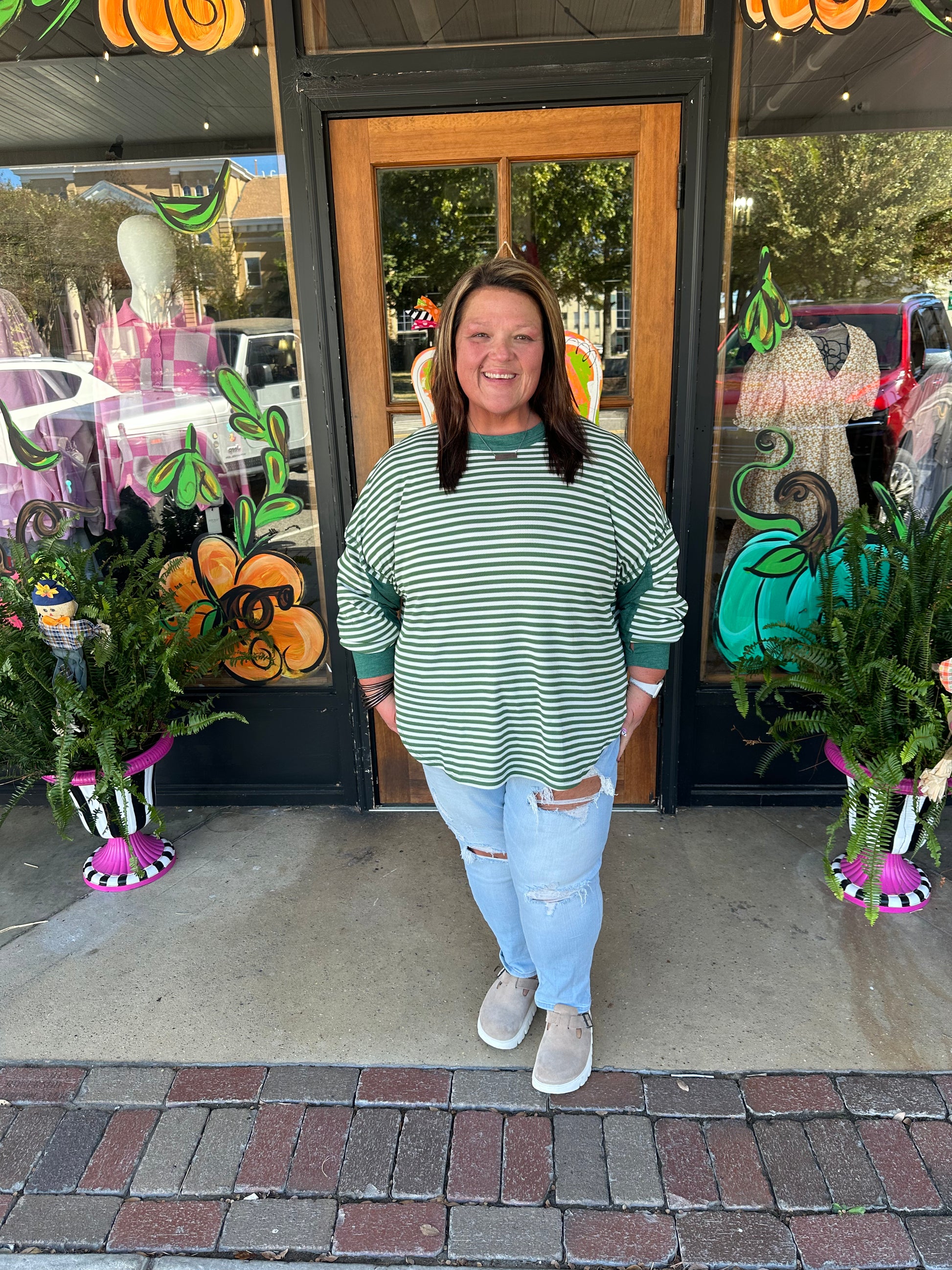 Green Stripe Exposed Seam Patchwork Plus Size Thermal Waffle Top
