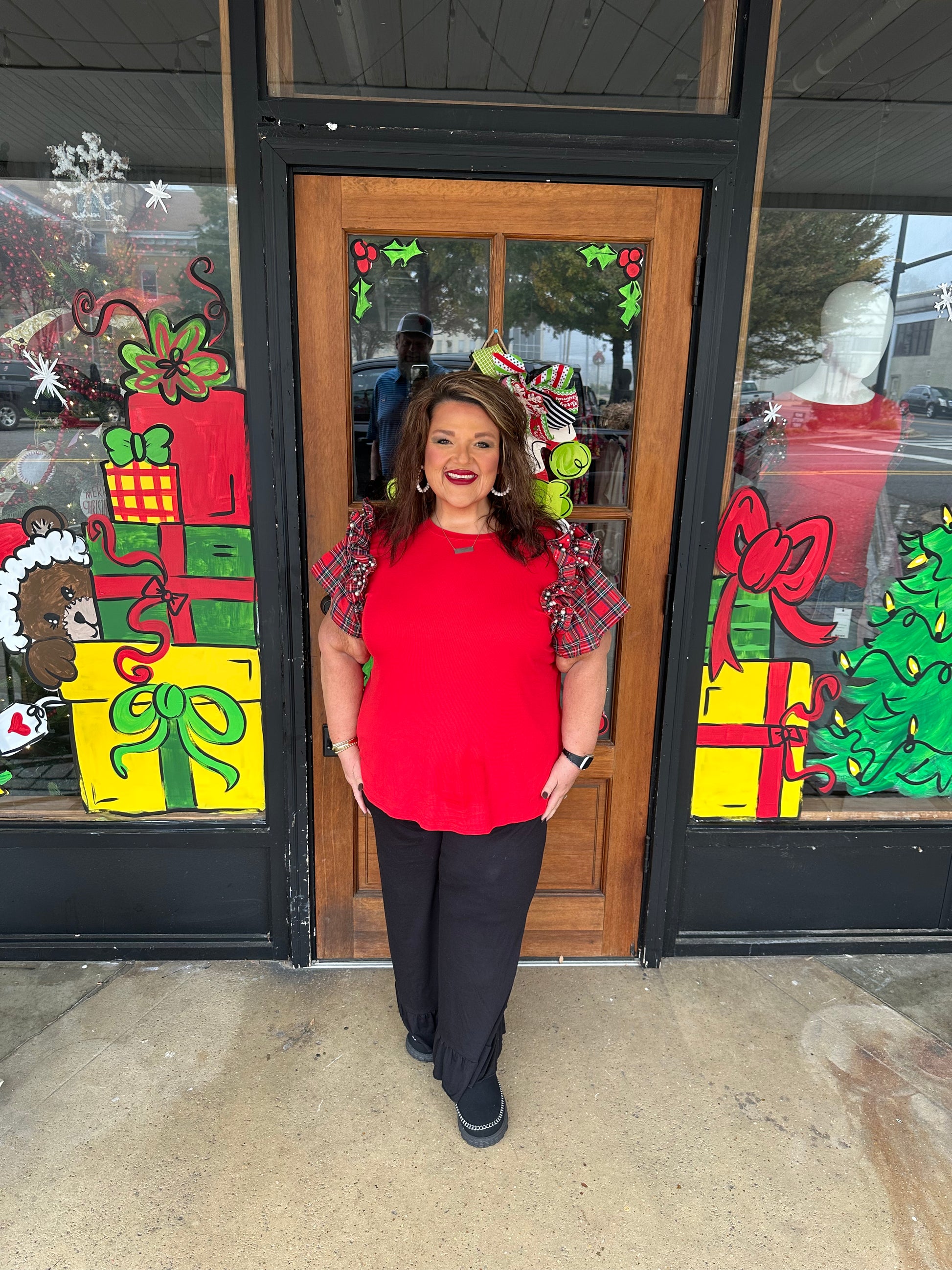 Racing Red Plaid Pearl Ruffled Sleeve Knitted Christmas Holiday Plus Size Top
