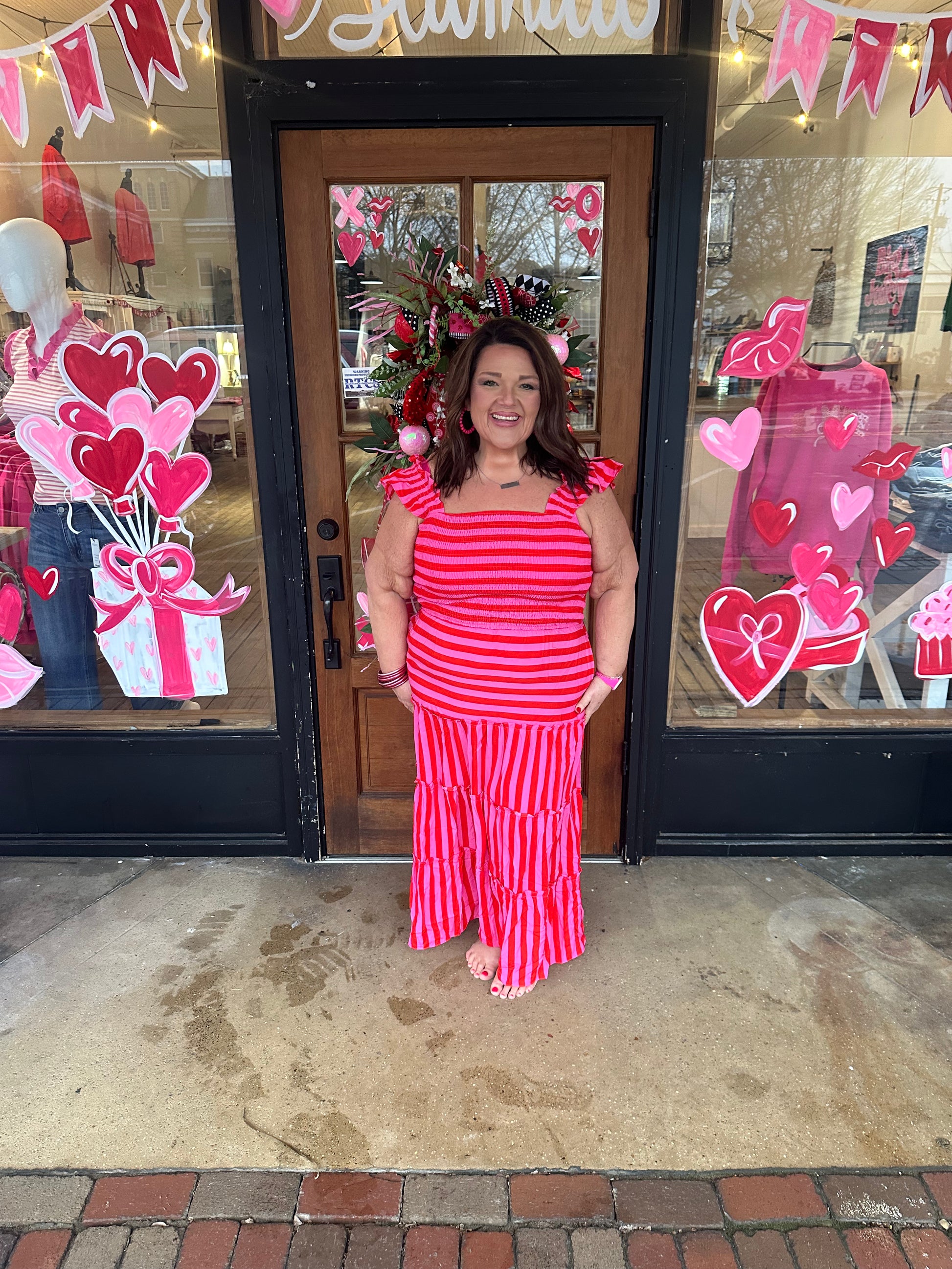 Rose Stripe Ruffle Strap Shirred Bodice Tiered Maxi Dress